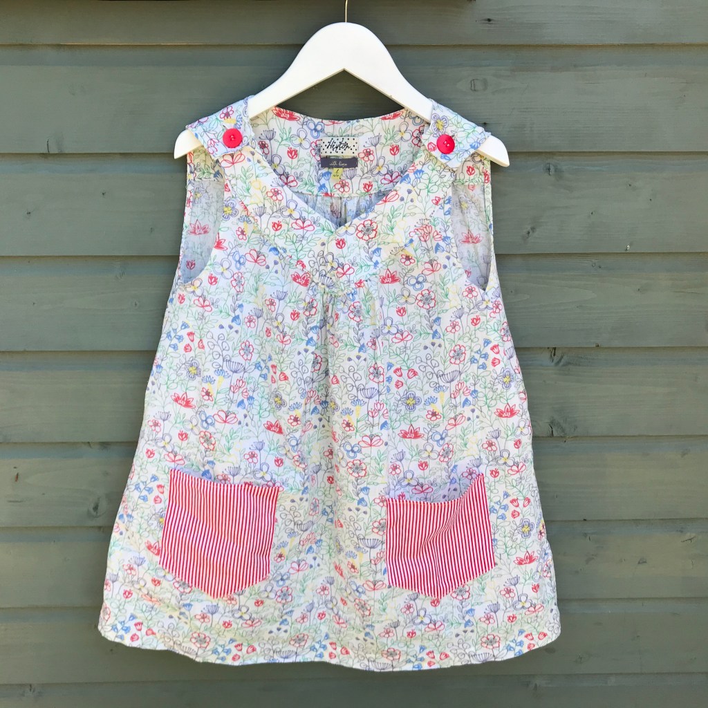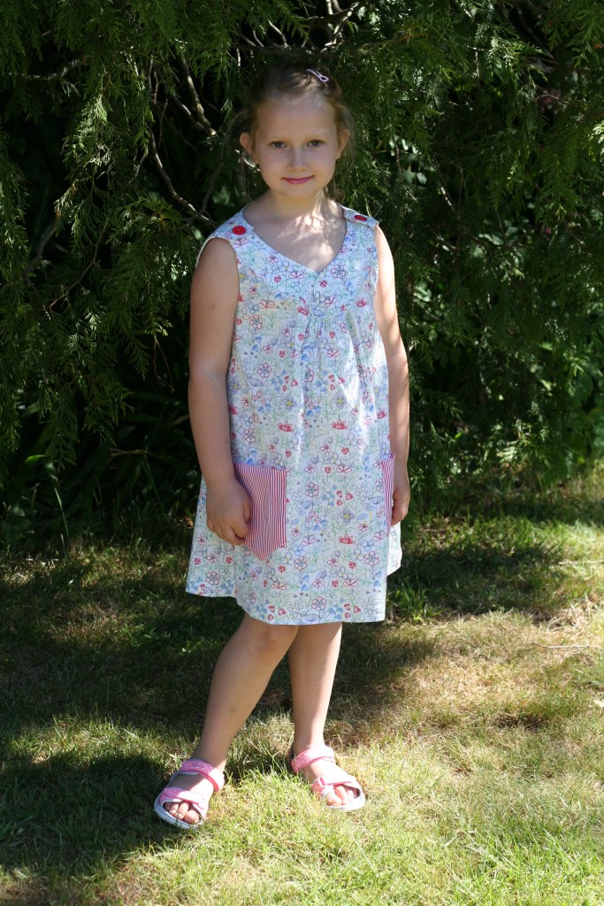 I tapered in the neckline making in into a V-neck by taking off the existing buttons. I opened up the top straps to make some button holes so she can get it on more easily. This is important to think about for children’s clothes. The red buttons were from our spare button box and make a fun contrast. I included some darts in the side seams to bring in the fit. Finally, I sewed on the striped pockets from some scrap fabric I had spare from a previous project . I did plan to do some clever internal pockets in the seams but my daughter wanted them on the front; there is more chance of her wearing it now!