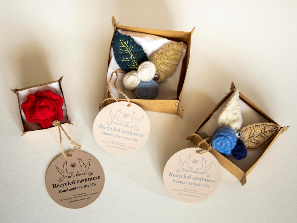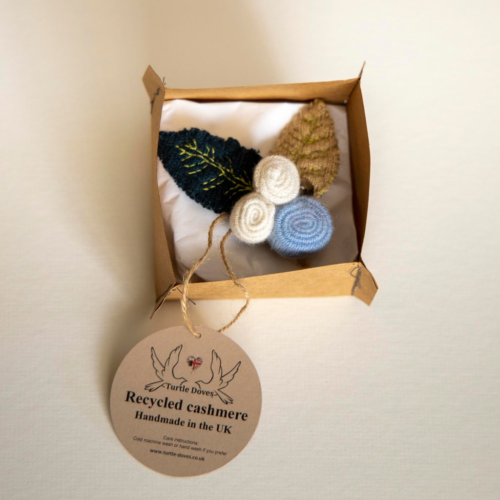 I love that Turtles Doves is also looking for ways to reduce their waste too even after the recycling process. Some of the scraps of cashmere left over from making gloves or shawls have been put together in little bundles to make these brooches. They cost £16 for enough scraps of cashmere to make 3, with the clasps and helpful instruction booklet that comes with it.