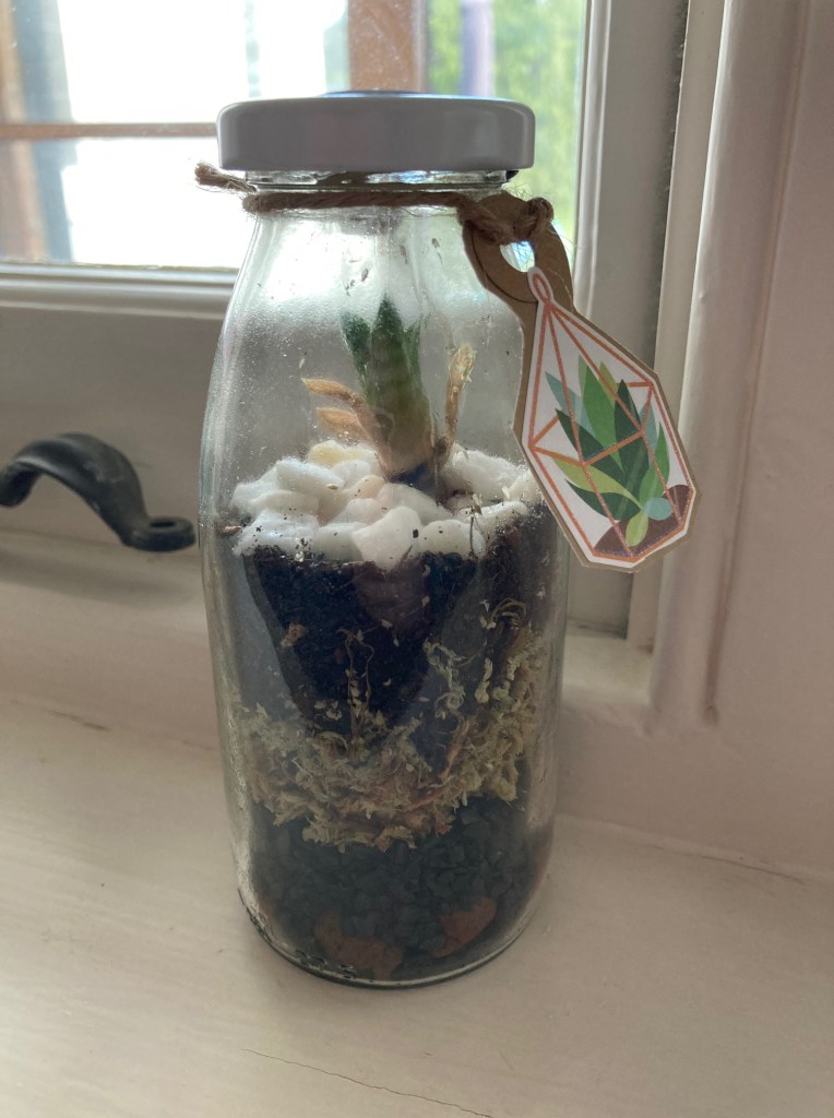 This is one of my all time favourite little Eco Gifts. Inside the bottle is a unique little Eco mini eco-system that generates the perfect environment to sustain plant life. Condensation forms on the inside of the glass and the water droplets roll down into the soil to water the plants. The moisture recycling continues without the need for added water and the plants will thrive in the moisture-rich environment. After planting the terrarium, the garden goes on autopilot and all you have to do is enjoy looking at them! It is made using layers of drainage stones, charcoal (which you can buy from pet shops as it it used for cleaning fish tanks) some soil, moss, decorative stones and a little succulent plant. See instructions below for how to build your terrarium in a bottle.