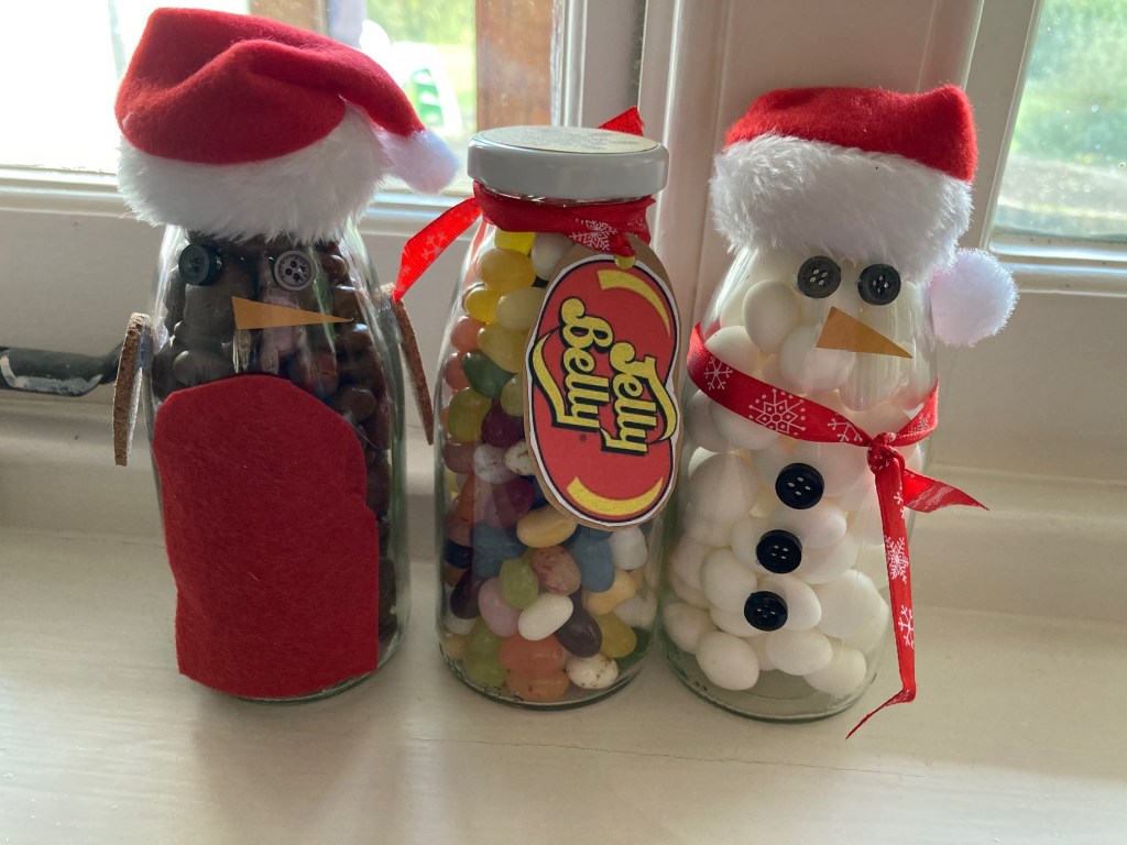 These make really easy low cost gifts. for the snowman I used imperial mints, for the robin chocolate raisins. The Jelly Belly jar is a good eco conscious option as they are certified as vegetarian, gluten free and have no palm oil unlike other jelly bean type sweets.
