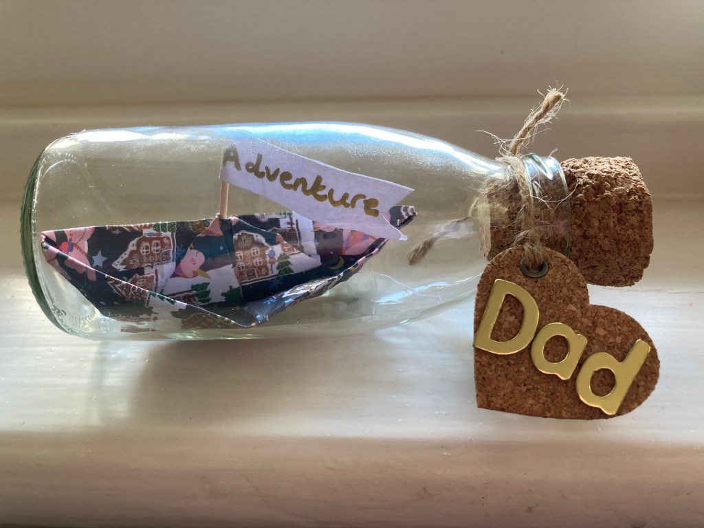 Putting a ship in a bottle dates back to the mid 18th century and was thought to have been a pastime for sailors at sea. They would create mini versions of the boat they were sailing and place in a bottle in case of a storm it is a record of the ship. I have always been intrigued about how the ship squeezes through the bottle neck. It is actually some clever engineering with some pullies and string that lifts the sails once inside. For my version of the ship in a bottle is a simple origami boat. I then used a cocktail stick with a sail reading ‘adventure’ with a thread attached to it to pull up the sail. I then replaced the crew top lid with a cork. I think many people will like the sentiment of a gift of going on an adventure with someone as being thoughtful.