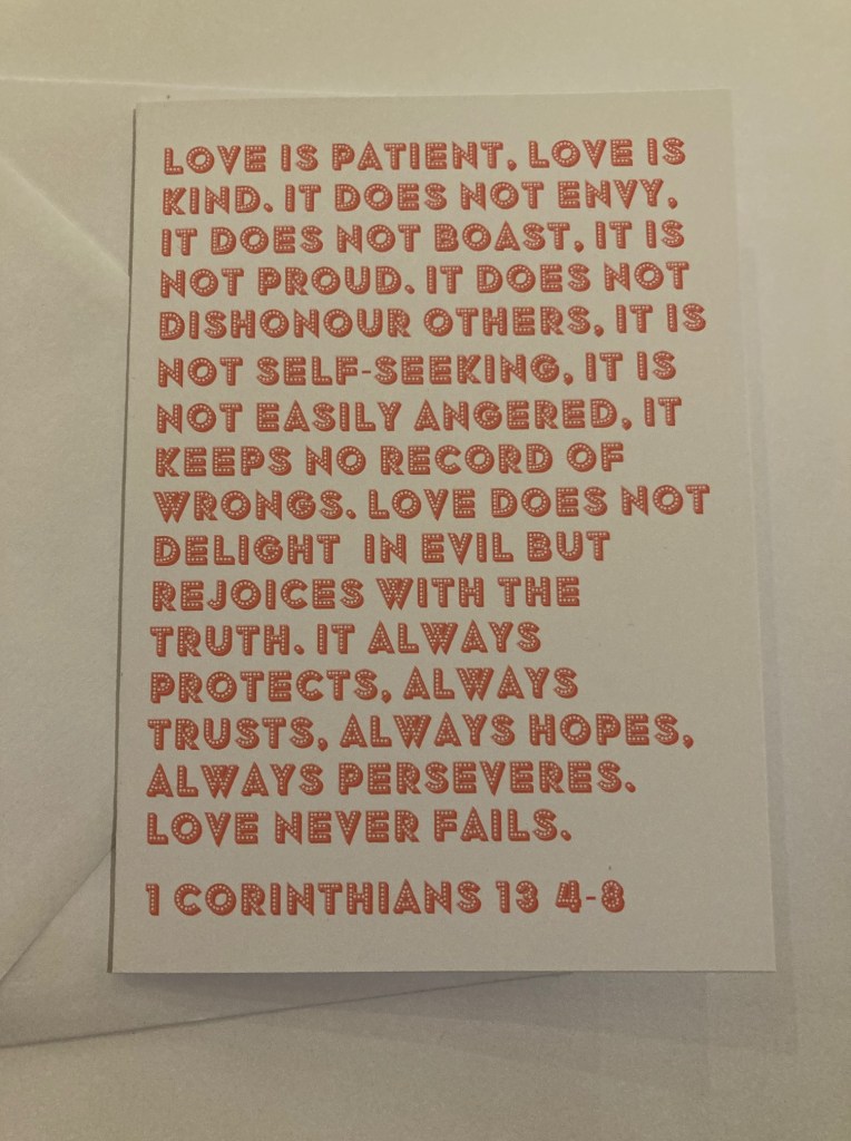 Love is patient, love is kind. It does not envy, it does not boast, it is not proud. It does not dishonor others, it is not self-seeking, it is not easily angered, it keeps no record of wrongs. Love does not delight in evil but rejoices with the truth. It always protects, always trusts, always hopes, always perseveres. Love never fails.